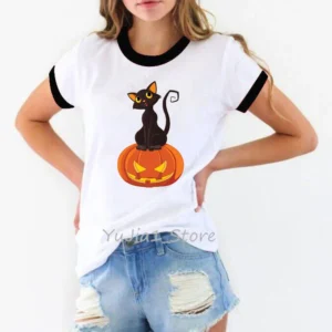 Happy Halloween shirt women funny black cat pumpkin print cartoon tshirt women’s ringer tee white t-shirt camisa feminina tops
