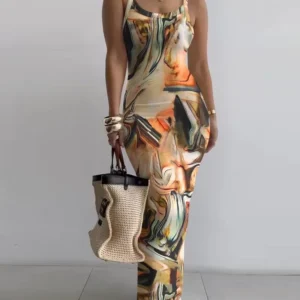Marble Print U-Neck Sleeveless Maxi Dress Women Fur Party Night Prom Long Dress High Waist Club Streetwear Elegant Sexy Vestidos