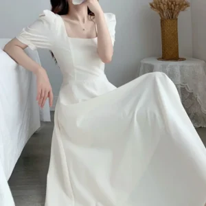 Women Puff Sleeve Elegant Dress Square Collar A-line Casual Dresses Solid Wedding Dress Beach Vestidos For Lady Summer