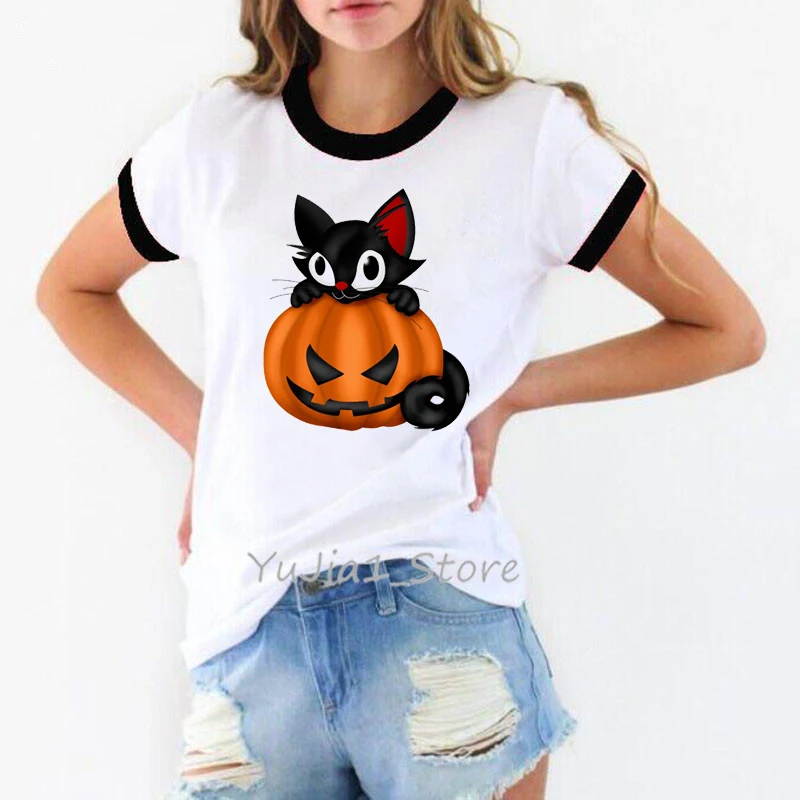 Happy Halloween shirt women funny black cat pumpkin print cartoon tshirt women’s ringer tee white t-shirt camisa feminina tops
